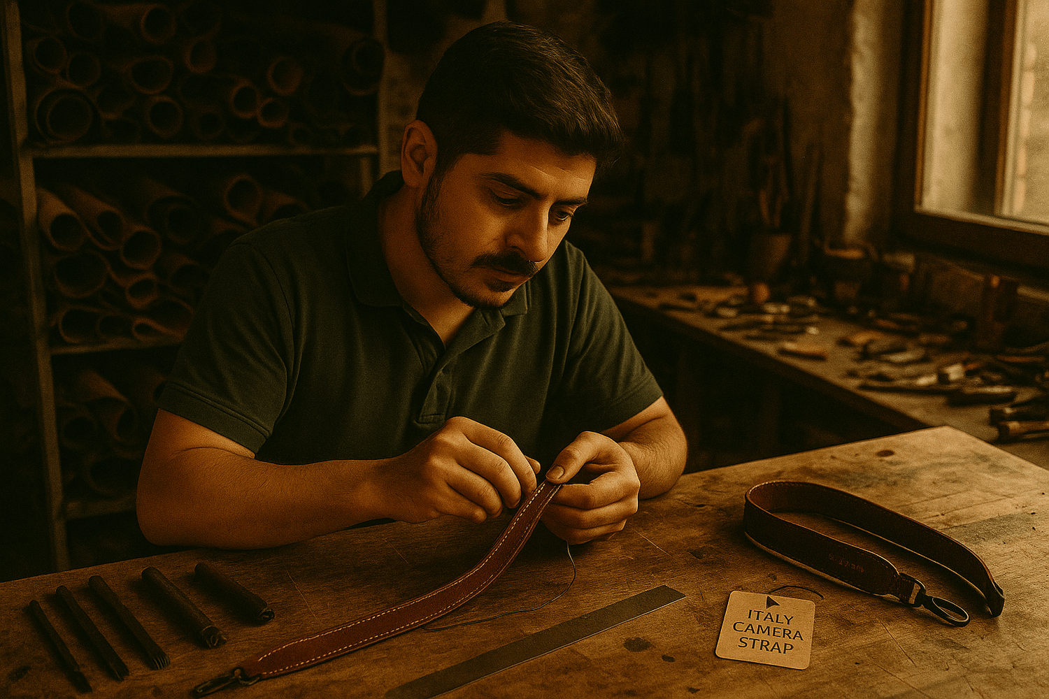 Our small workshop is located in Italy and this is me! We produces a few pieces at a time, rigorously created by my hand piece by piece. All our leather camera strap is made in Italy.